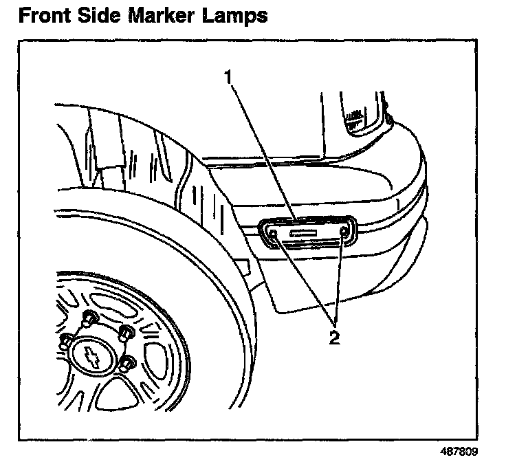 The front side marker lamps (1) are mounted in the front bumper fascia. Each lamp consists of a single filament bulb covered by amber colored lenses. They are operational any time the parking lamps or headlamps are activated.