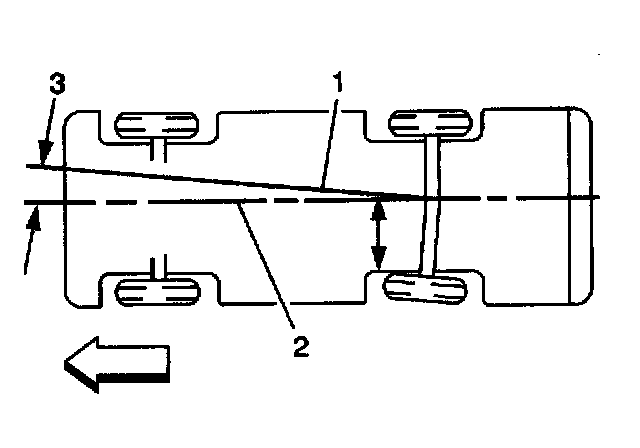 In the illustration, toe-in is shown on the left rear wheel, moving the thrust line (1) off center. The resulting deviation from the centerline is the thrust angle.