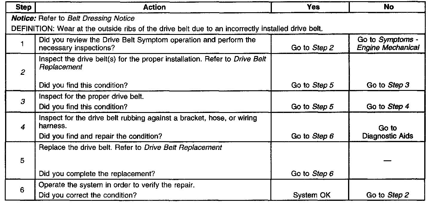 3. The installation of a drive belt that is two wide or two narrow can cause wear on the drive belt. The drive belt ribs should match all of the grooves on all of the pulleys.