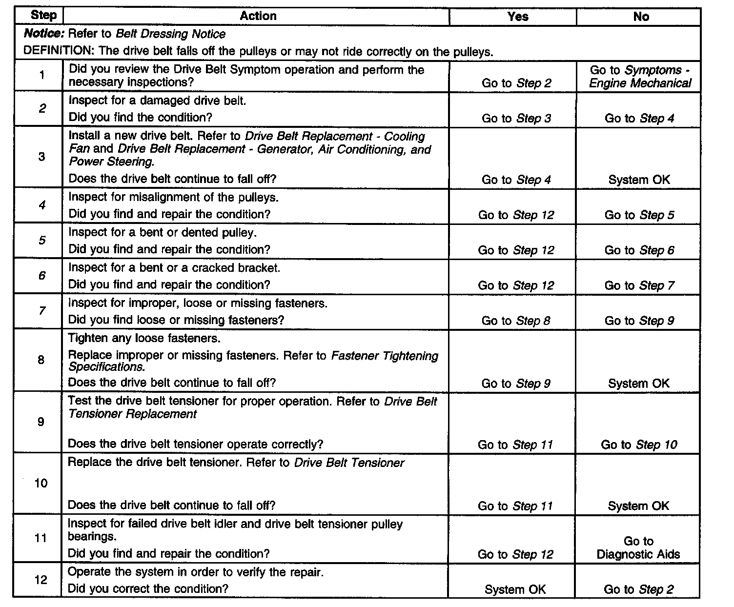 An extra load that is quickly applied and released by an accessory drive component may cause the drive belt to fall off the pulleys. Verify that the accessory drive components operate properly.