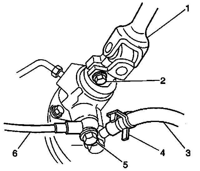 2. Install the power steering gear inlet hose (6) and the 2 gaskets to the steering gear. Secure the hose to the gear with the fitting (5).