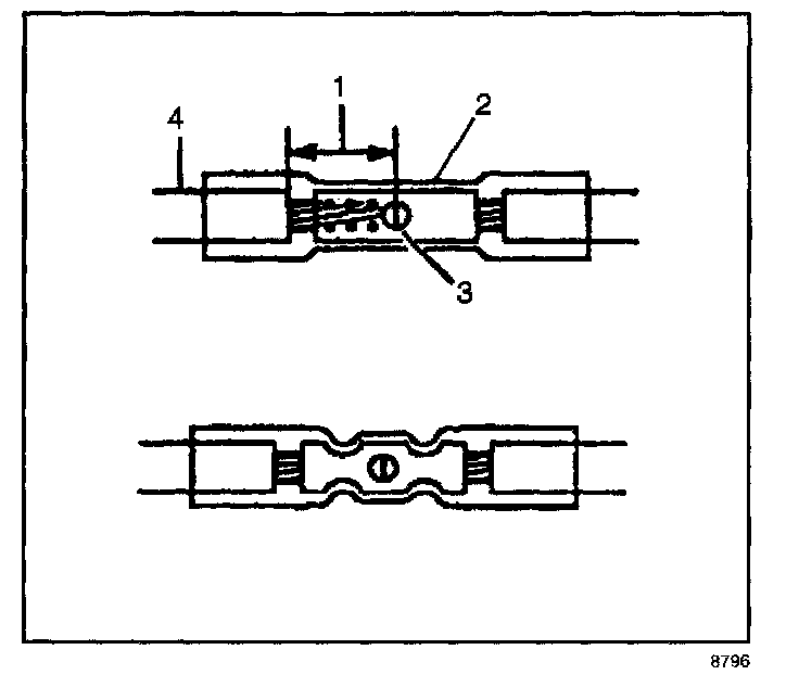9. Insert the wires into the splice sleeve until the wire hits the barrel stop. The splice sleeve has a stop in the middle of the barrel in order to prevent the wire from passing through the splice (3).