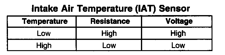 The PCM applies 5 volts to the IAT sensor. The PCM monitors the voltage drop across the IAT sensor and converts the voltage reading into a temperature value. The IAT sensor voltage reading at the PCM will vary with the changes in the intake air temperature.