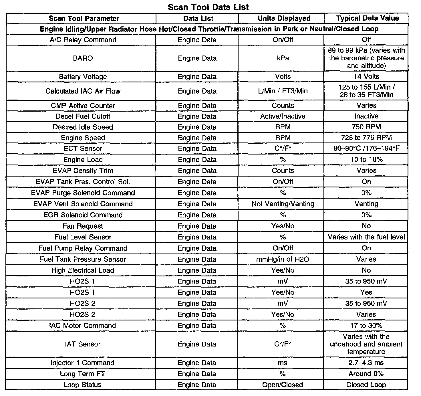The scan tool values from a correctly operating engine may be used for comparison with the engine you are diagnosing. The values listed in the following table represent typical values that would be seen on a good running engine.