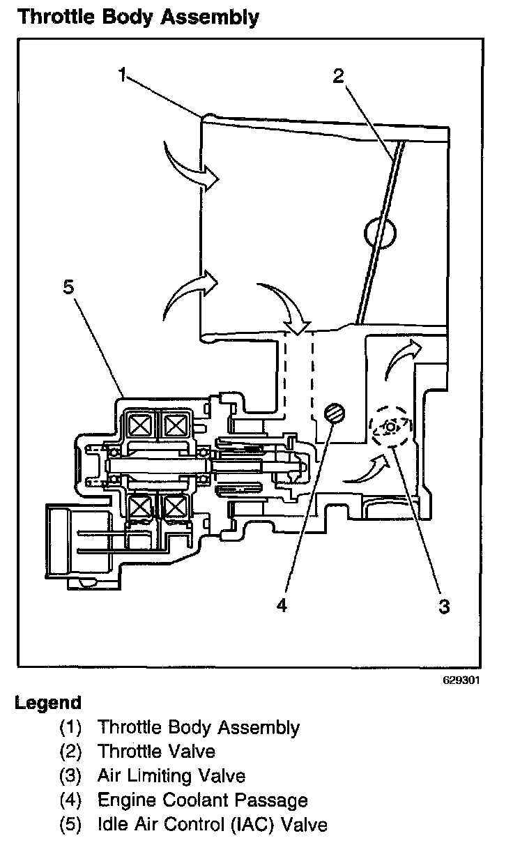 The throttle valve is interlocked with the accelerator pedal by the accelerator control cable. The throttle valve controls the large volume of air that is drawn into the intake chamber. The idle air bypass passage provides air for the control of engine speed when the throttle valve is closed. The air limiting valve provides additional bypass air to engine when the engine is cold. The air limiting valve is a bi-metal spring that is preset at the factory and cannot be adjusted. The air limiting valve is not serviced separate from the throttle body assembly. The throttle body is warmed by engine coolant that flows through the idle air control valve and into a coolant passage located in the throttle body. The warming of the throttle body helps prevent throttle valve icing. Attached to the throttle body are the Throttle Position (TP) sensor and the Idle Air Control (IAC) valve.