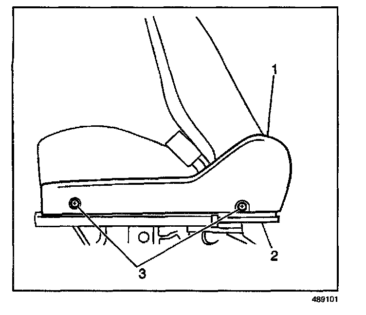 3. Install the front seat inner adjuster finish cover (1) to the front seat inner adjuster (2). Secure the finish cover with the 2 screws (3).
