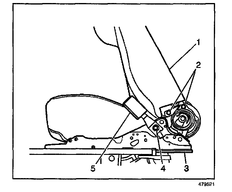 1. Install the front seat belt buckle (5) to the front seat inner adjuster (3). Secure the buckle with the anchor bolt (4).