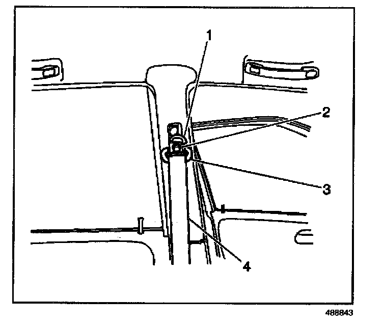 7. Install the shoulder guide anchor bolt (2) which secures the front seat belt (4) to the center pillar.