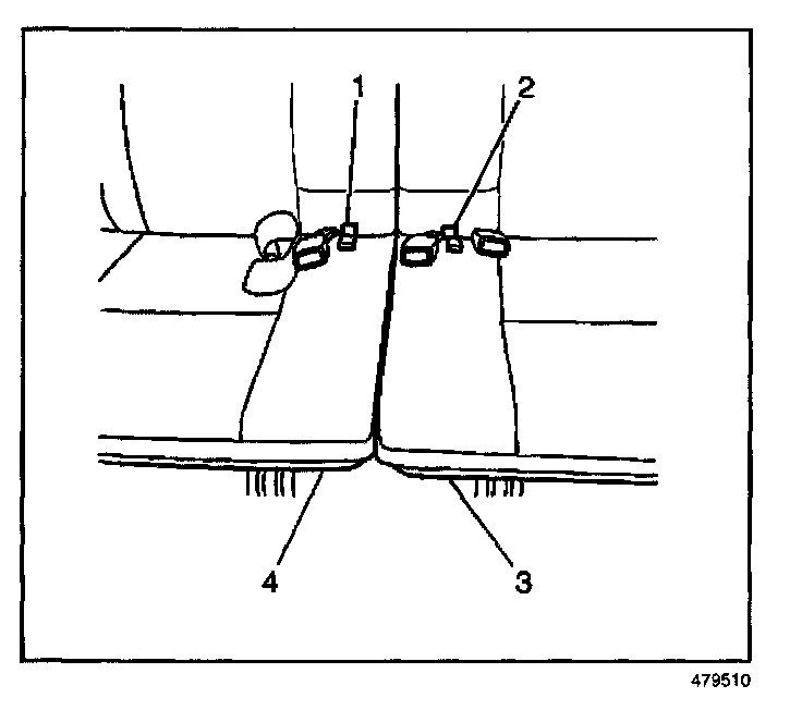 1. Pull the rear seat pull straps (1 and 2) and raise the rear seat cushions (3 and 4) in order to gain access to the rear seat center belt and buckle bolts.