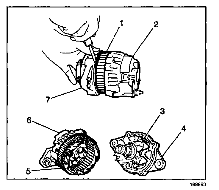 4. Using a flat-bladed tool, gently pry off the front housing (7) (with the drive pulley and the rotor) from the stator coil (1) and the rear housing (2).