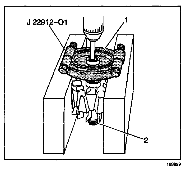 11. Remove the rear bearing (1) from the rotor using a J 22912-01 and a press.