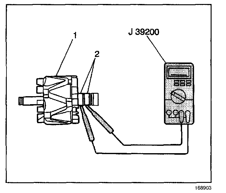 2. Measure the resistance between the rotor slip rings (2) and the rotor (1) using the J 39200. If the resistance is less than 5 ohms, replace the rotor.