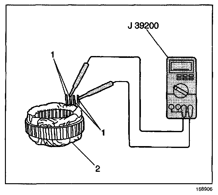 5. Measure the resistance between all stator leads (1) and the stator core using J 39200. If the resistance is less than 5 ohms, replace the stator (2).