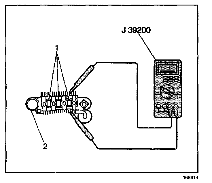 8. Measure the resistance between the rectifier lower body (2) and each diode lead (1) using the J 39200. Reverse the probes and measure the resistance again. The resistance should be less than 5 ohms in one measurement and greater than 5 ohms in the other measurement. If not, replace the rectifier.