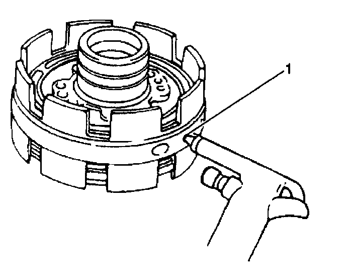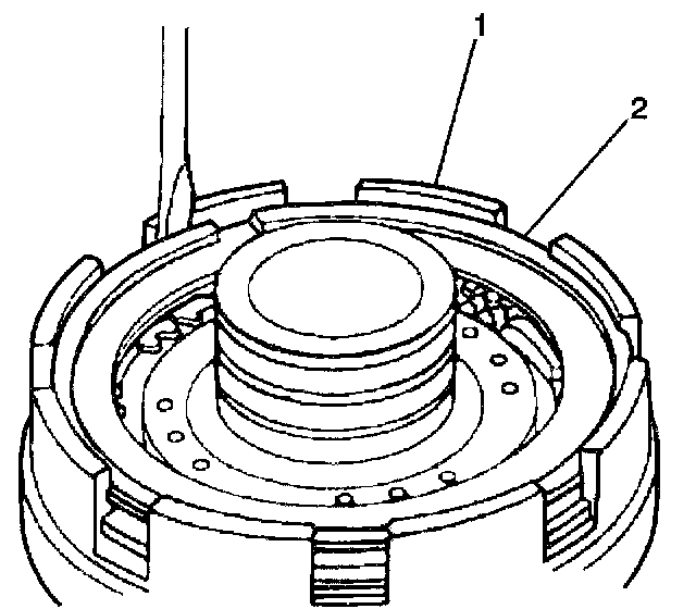 5. Remove the B1 brake clutch snap ring (2) from the center support (1) using a flathead screwdriver.