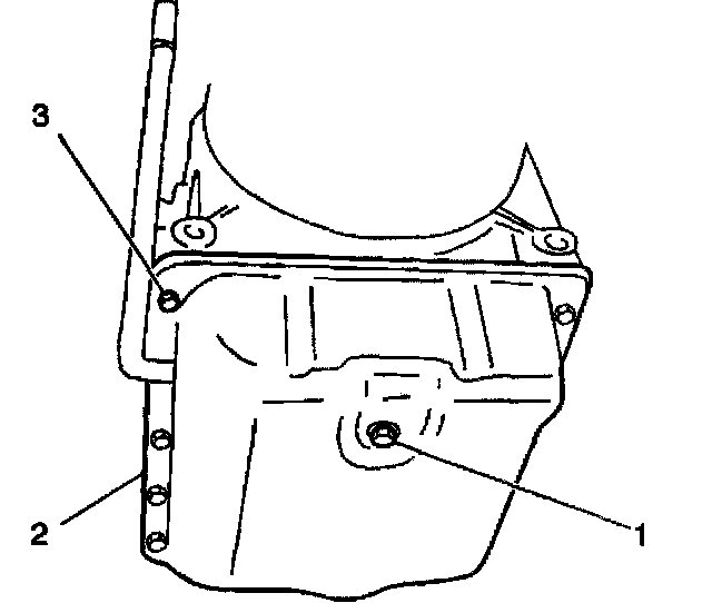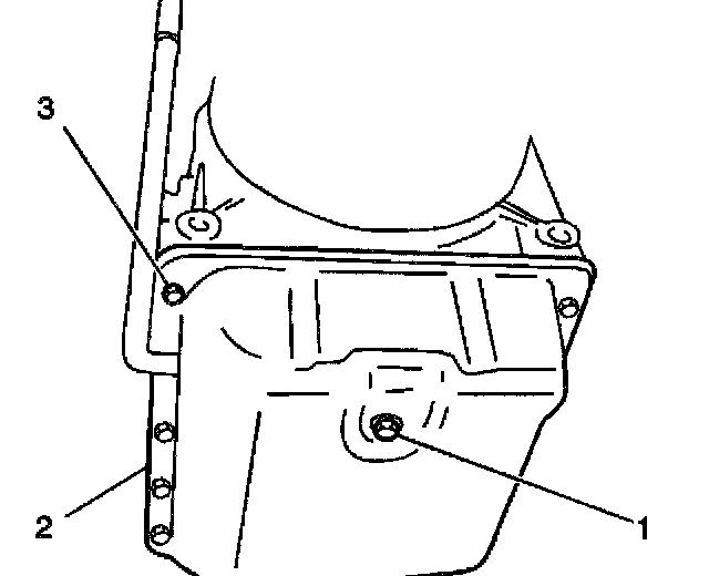 9. Remove the transmission fluid pan (2) the bolts (3) and the gasket from the transmission.