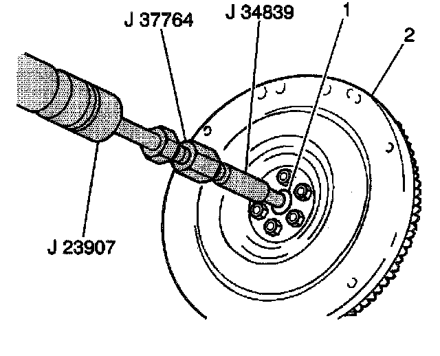 3. Remove the clutch pilot bearing (1) from the crankshaft using the J37764, J34839 and the J23907