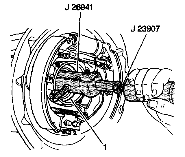 9. Remove the rear axle shaft inner oil seal (1) from the rear axle housing using the J26941 and the J23907.
