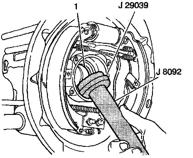 1. Install the new rear axle shaft inner oil seal (1) into the rear axle housing using the J29039 and the J8092.