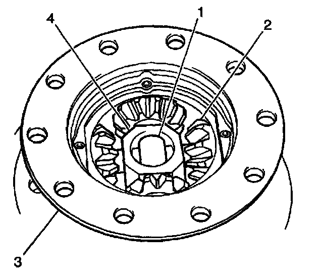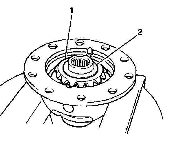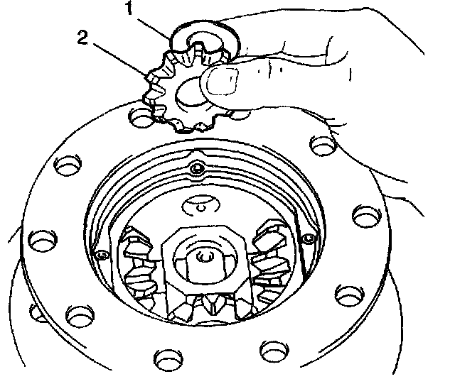 6. Install the left differential side gear (1) and washers (2) into the right differential case.