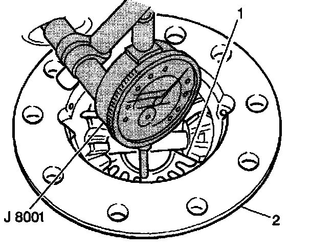 3. Insert fingers through the bottom openings of the right differential case (2) half and move the right differential side gear (1) up and down while observing the J8001. The right differential side gear end play should measure 12 - 37 mm (0.005 - 0.014 inch).