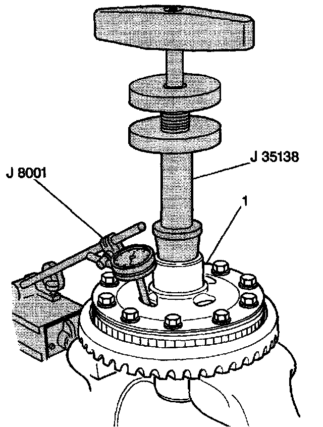 12. Move the J35138 up and down while observing the J8001. The left differential side gear end play should measure 12 - 37 mm (0.005 - 0.014 inch).