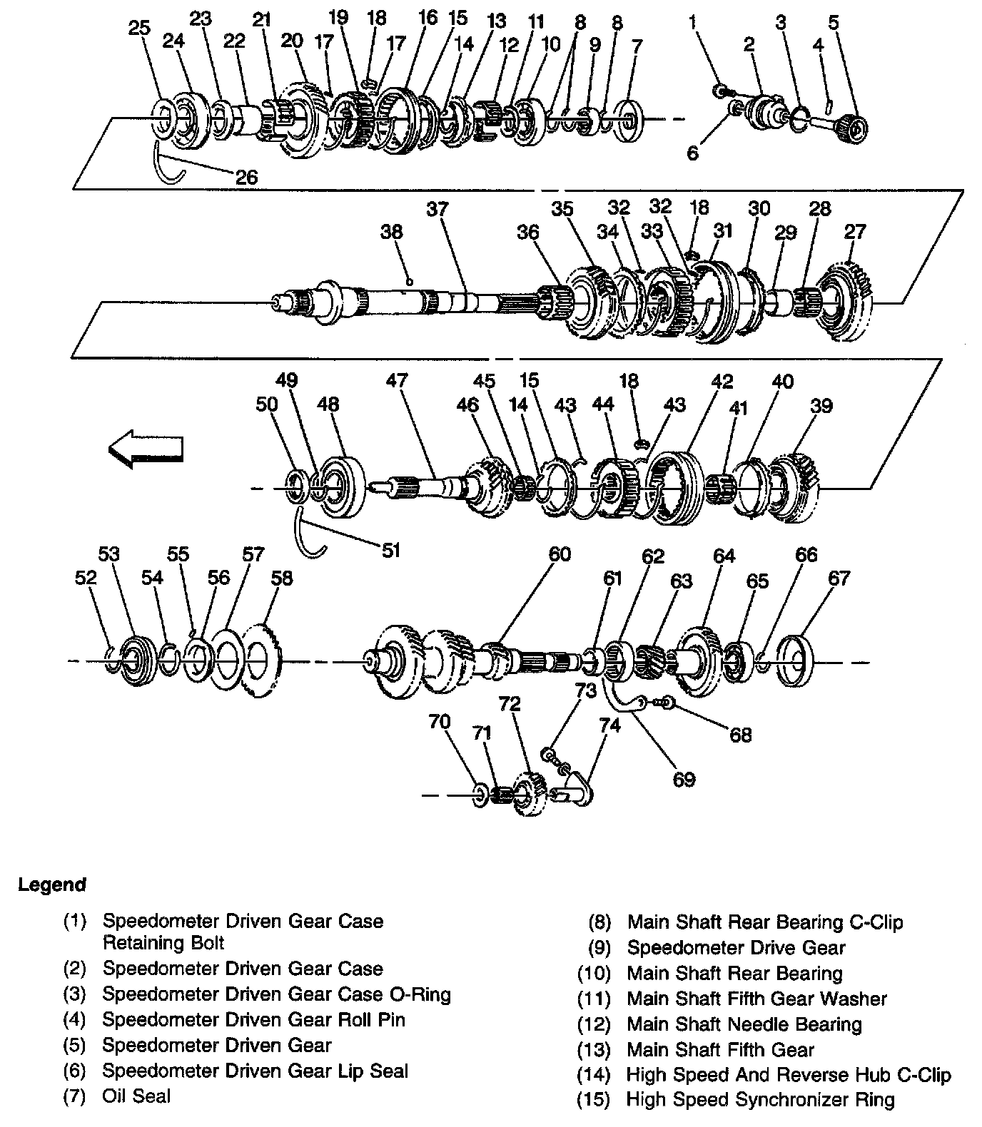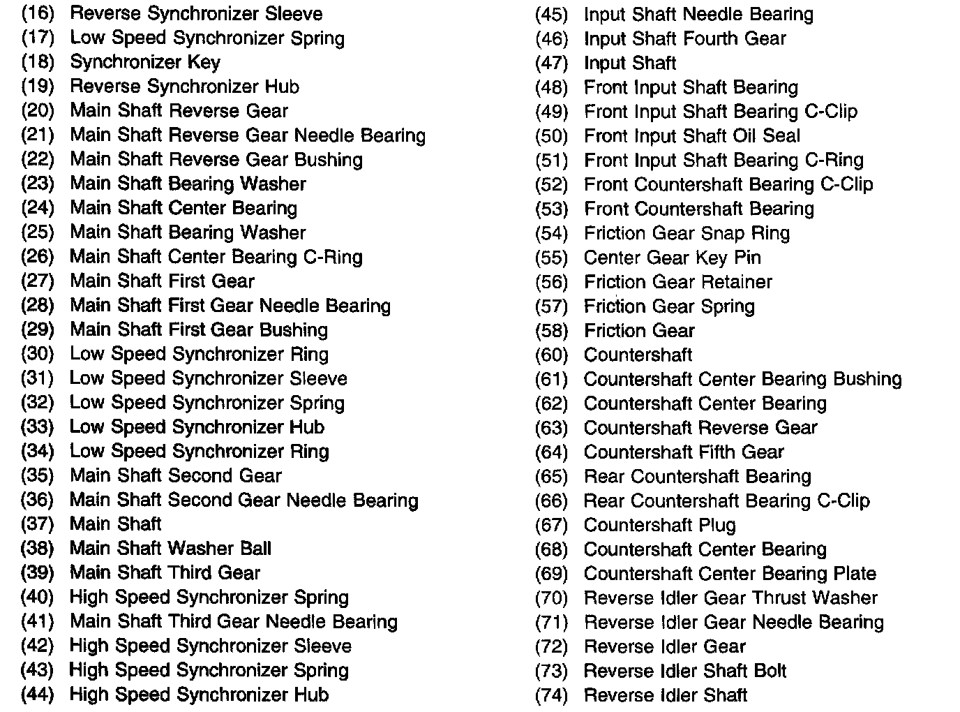 The low speed synchronizer is mounted on the main shaft and will engage with either the main shaft first or the main shaft second gear. The high speed synchronizer is also mounted on the main shaft and will engage with either the main shaft third or the input shaft fourth gear. The reverse synchronizer is mounted on the main shaft and engages with the main shaft fifth or the main shaft reverse gear. The countershaft meshes with the main shaft to produce the appropriate gear ratio output.