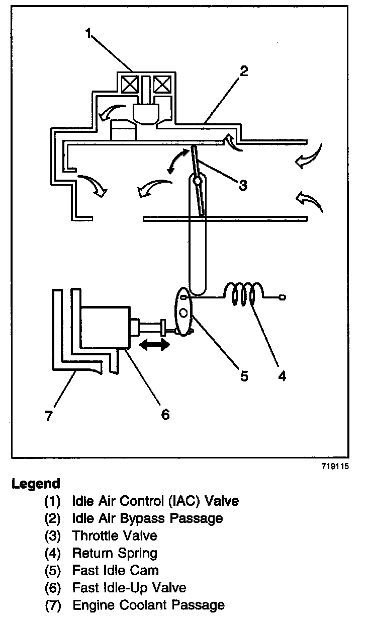 When the engine is cold, the fast idle-up valve (6) opens the throttle valve (3) slightly, increasing engine speed. The fast idle-up valve (6) contains a wax pellet that moves a plunger in response to engine coolant temperature (7). The fast idle-up plunger opens the throttle valve by pushing the fast idle cam (5).