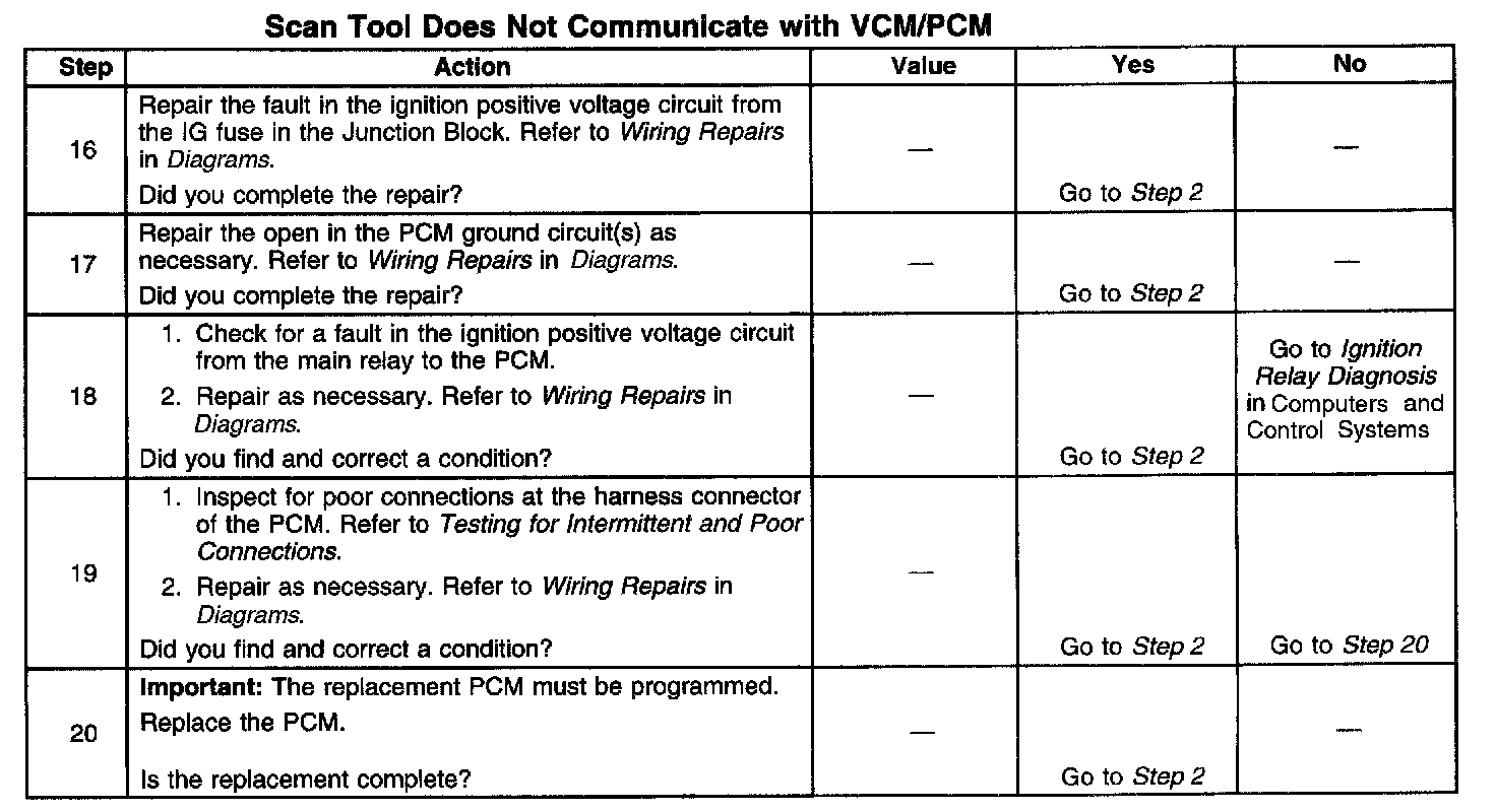 9. This step checks whether the PCM is receiving ignition positive voltage from the main relay when the ignition is ON. The PCM can not provide serial data without ignition positive voltage from the main relay.