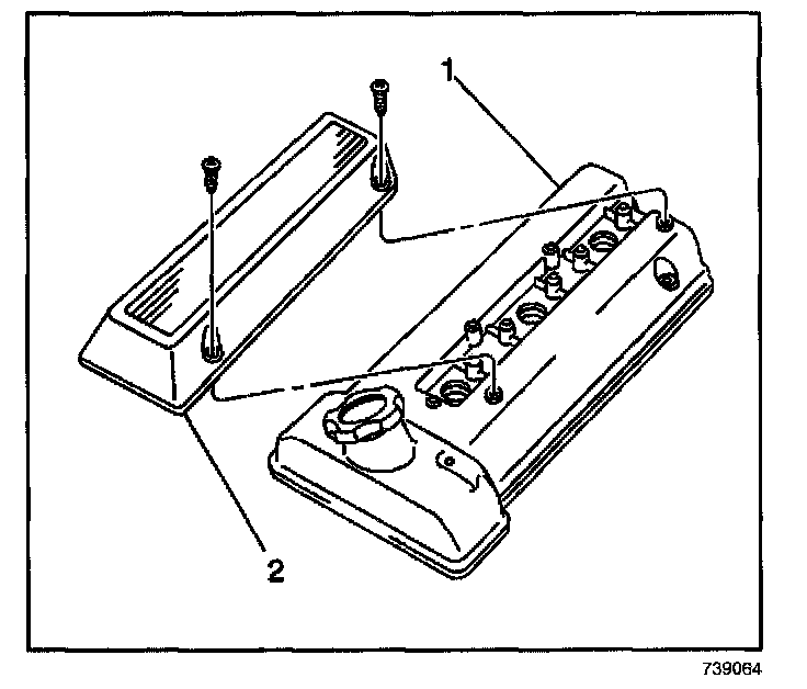 1. Remove the two fasteners and the ignition coil cover (2) from the valve cover (1).