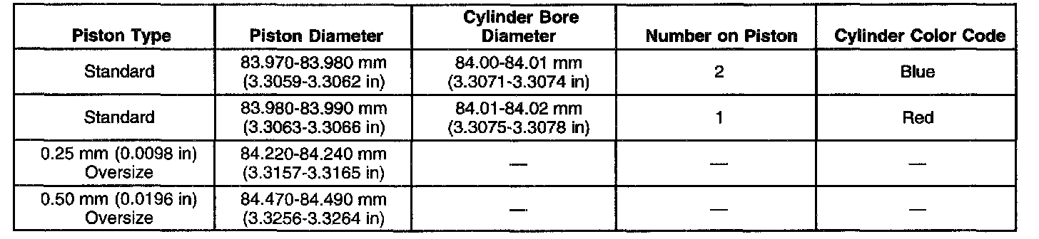 Piston Selection Table