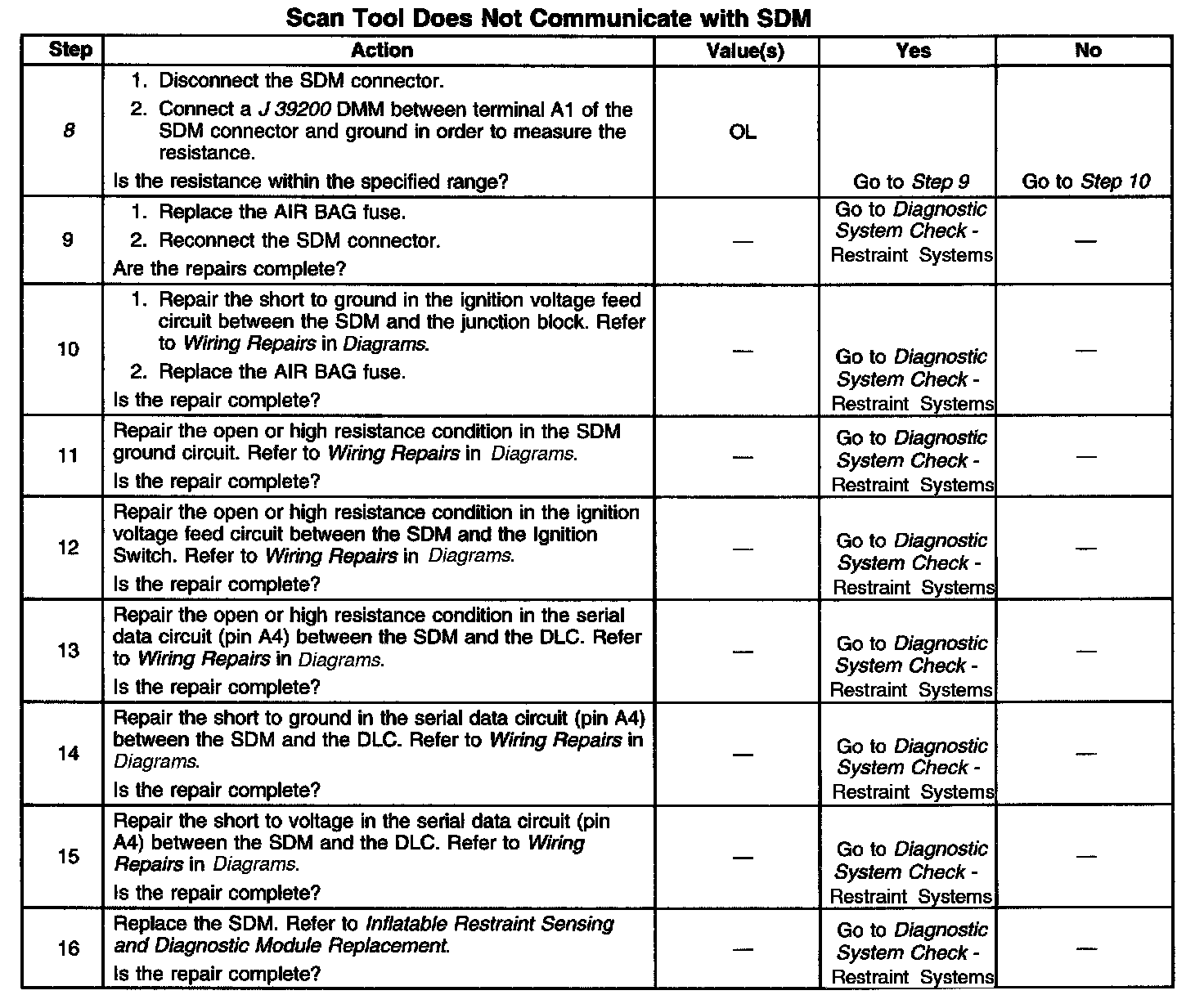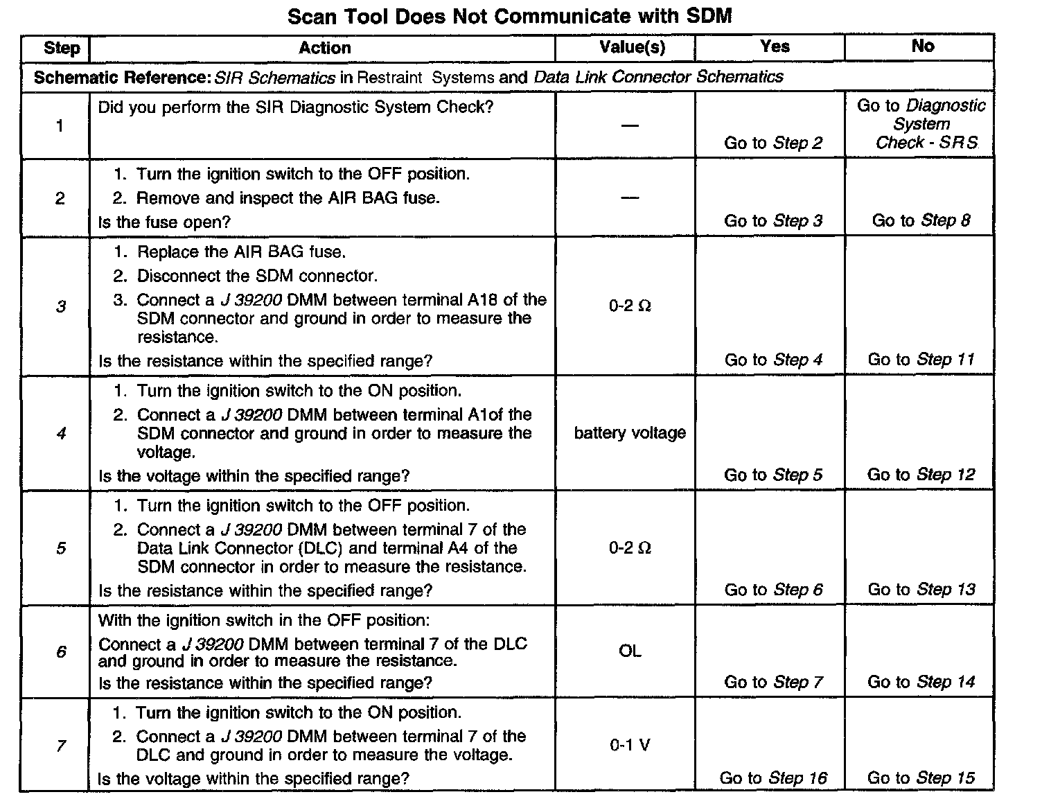 When measurements are requested in this table, use J 39200 Digital Multimeter with the correct terminal adapter from J 35616-A Connector Test Adapter Kit. When a check for proper connection is requested, refer to General Electrical Diagnosis Procedures in Diagrams. When a wire, connector or terminal repair is requested, use J 38125-B Terminal Repair Kit and refer to Wiring Repairs in Diagrams. Diagnostic Aids