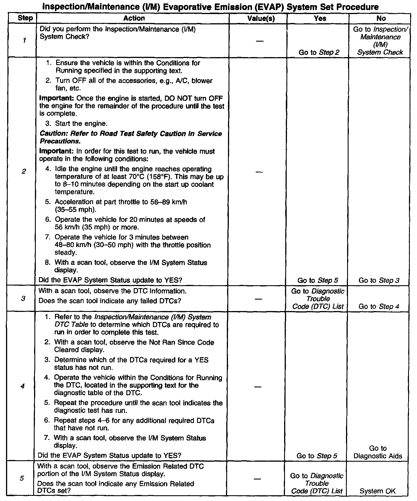 Extreme high or low ambient temperatures may prevent the EVAP System Tests from initiating. Performing a visual inspection prior to running the EVAP System Set Procedure may prevent having to repeat the test. A loose fuel cap may cause a test to abort or fail and prevent the I/M System Status from updating. A failed or aborted test will require the vehicle to cool down in order to meet the enable criteria to run another test.