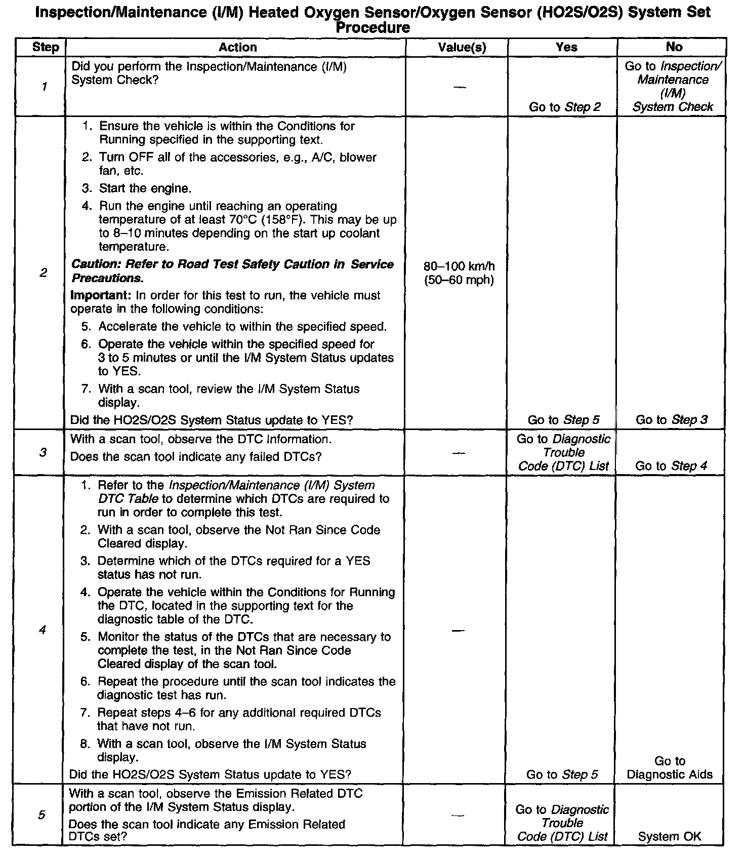 DESCRIPTIONThe purpose of this test is to satisfy the enable criteria necessary to execute I/M readiness diagnostics for the oxygen sensor (O2S, HO2S) system. The test may be used to set the I/M System Status to YES. Ensure the vehicle meets the requirements listed in Conditions for Running before performing this test. Failure to meet the necessary requirements may produce inaccurate test results.