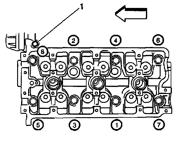 Tighten the cylinder head bolts (1-8) in the sequence shown to 84 Nm (61 ft. lbs.).