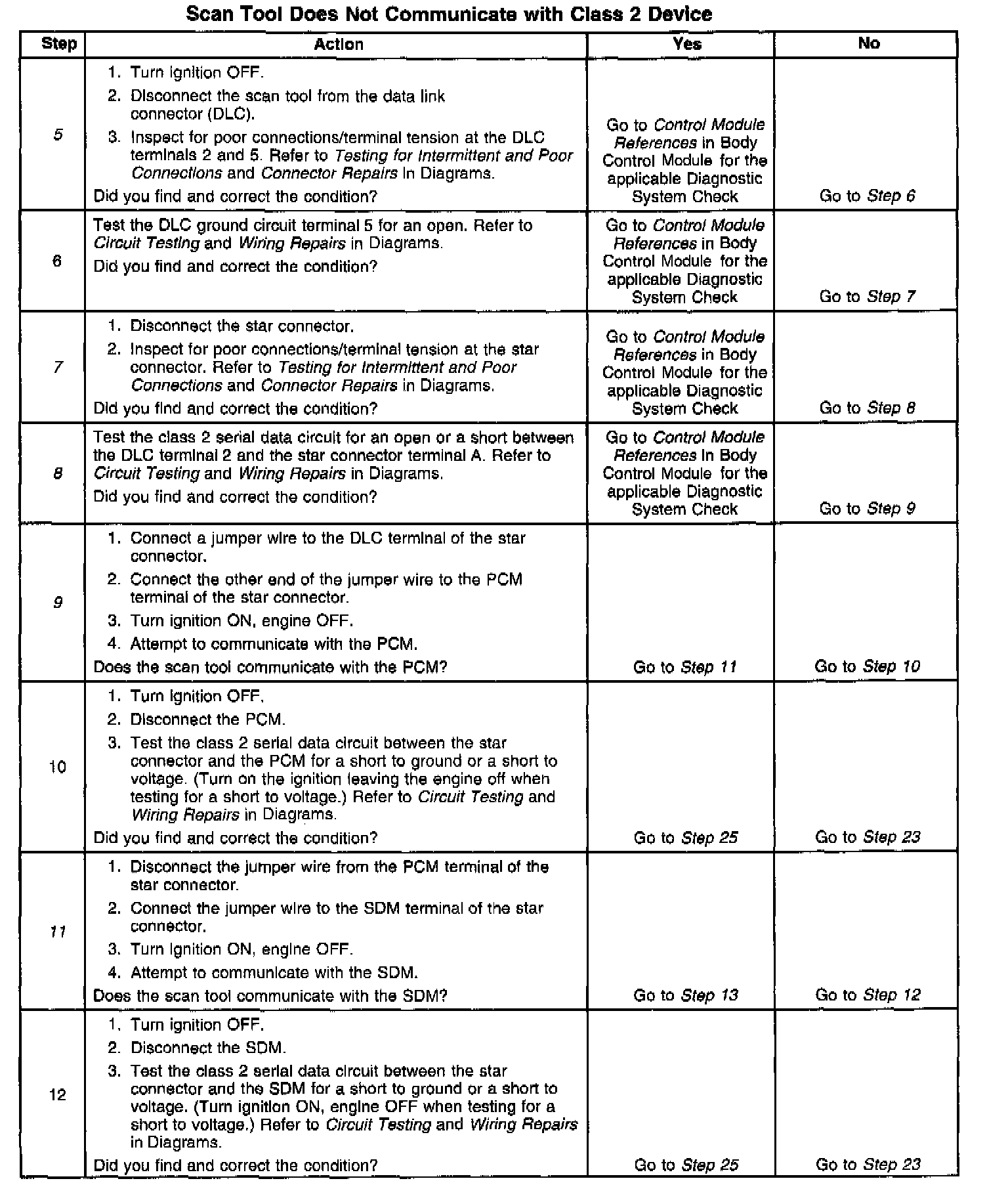 9. The class 2 serial data circuit is shorted to voltage or ground. The condition may be due to the wiring or due to a malfunction in one of the modules. When testing the wiring for a short, make sure there is not a module connected to the wire being tested. This test isolates the PCM class 2 serial data circuit.