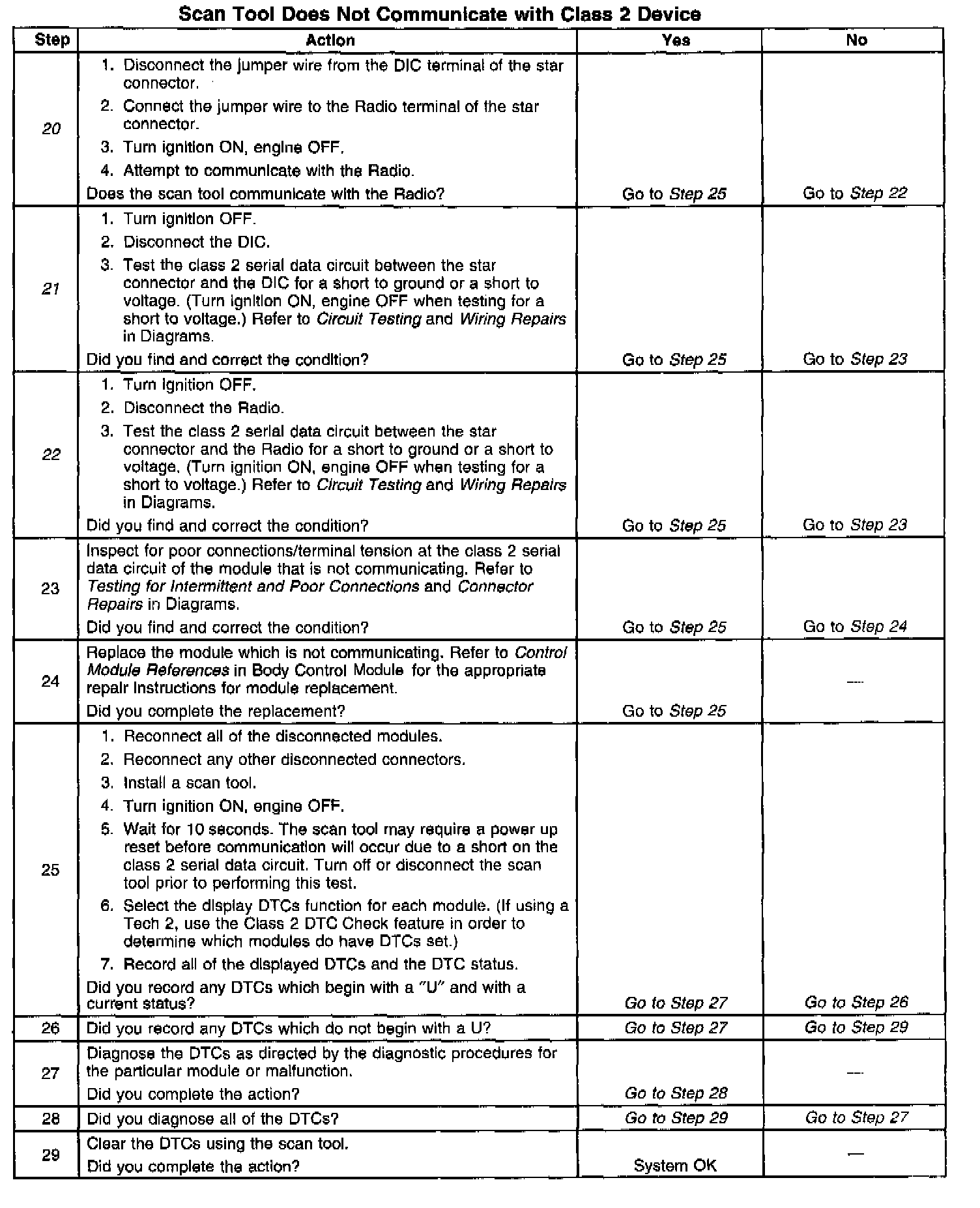 8. An open in the class 2 serial data circuit between the DLC and the star connector will prevent the scan tool from communicating with any module. This condition will not set a DTC.
