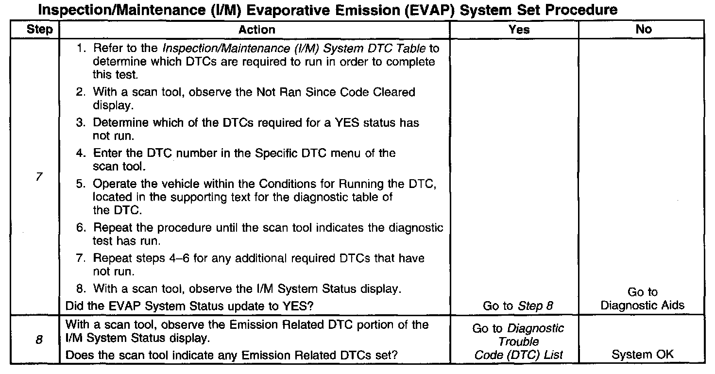 6. This step is to identify a first failure of a type B DTC. A DTC only appears on the I/M System Status display when it becomes a MIL illuminating DTC. This occurs on the second failure of a type B DTC. A first failure of a type B DTC will not allow the I/M System Status to update to YES. Refer to Diagnostic Aids.