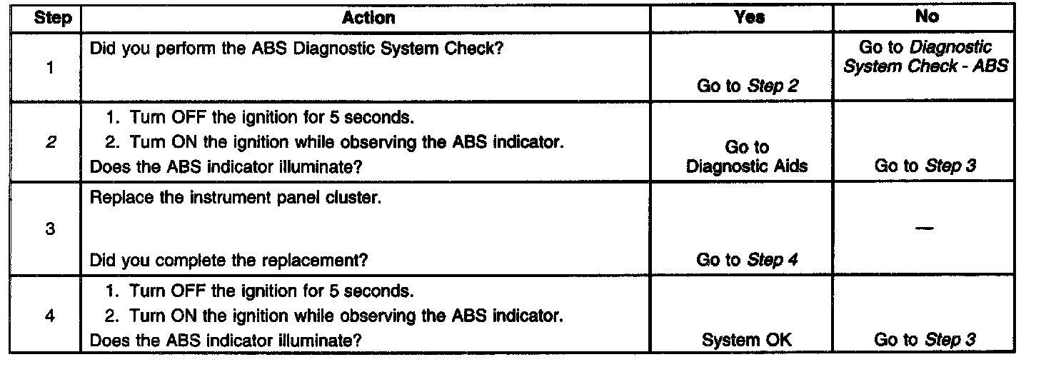 Replace the Instrument Panel Cluster if the ABS indicator intermittently fails to operate during the bulb check.