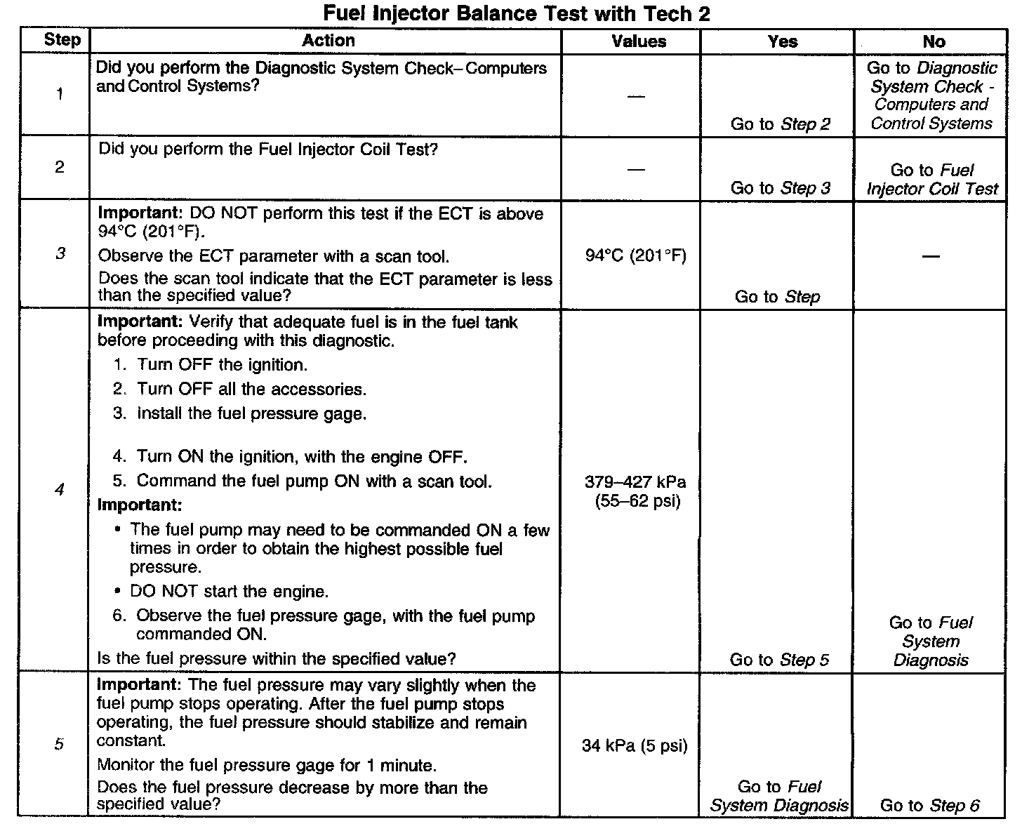 5. The fuel pressure should reach a steady value. Refer to Fuel System Diagnosis if the fuel pressure does not stabilize. Component Tests and General Diagnostics