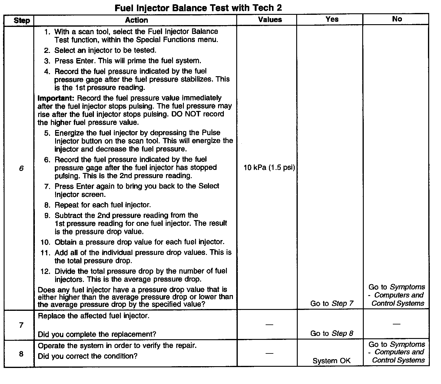 6. If the pressure drop value for each fuel injector is within 10 kPa (1.5 psi) of the average pressure drop value, the fuel injectors are flowing properly. Calculate the pressure drop value for each fuel injector by subtracting the second pressure reading from the first pressure reading.