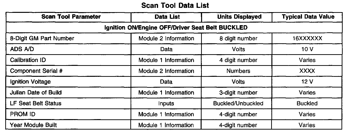 The SIR Scan Tool Data List contains all restraint system related parameters that are available on the scan tool. The parameters in the list are arranged in alphabetical order. The column "Data List," indicates the location of the parameter within the scan tool menu selections.
