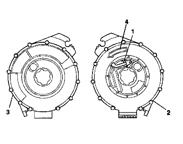 4. If no centering window is present on the front side (3) of the inflatable restraint steering wheel module coil, but a spring service lock (1) is on the back side (2), perform the following steps: