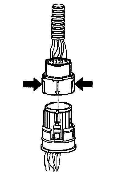 ^ In order to reinstall the external wiring connector, first orient the pins by lining up the arrows on each half of the connector. Push the connector straight down into the transmission without twisting or angling the mating parts.