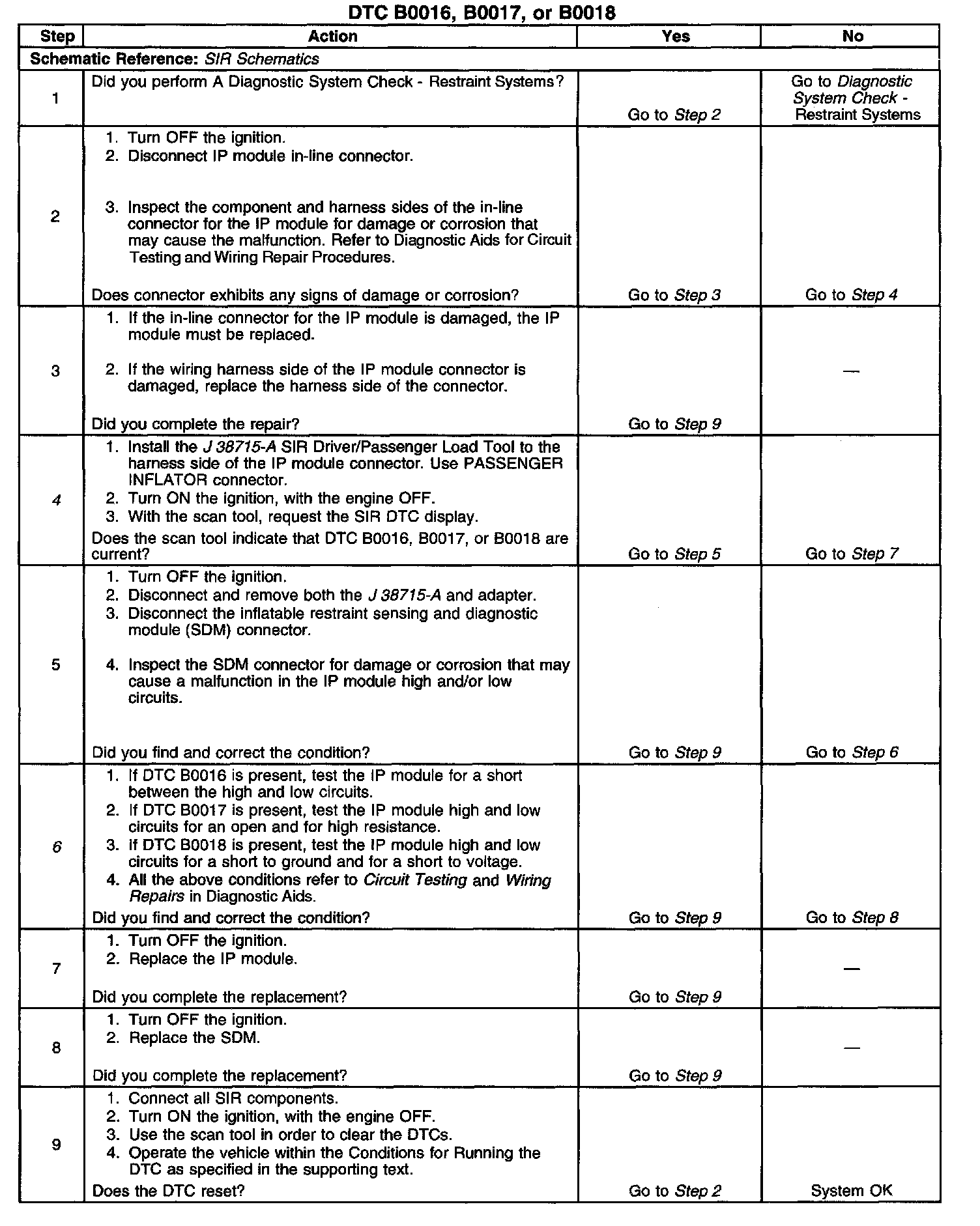 6. Tests to see what DTCs are present. If DTC B0016 is present, test the IP module for a short between high and low circuits. If DTC B0017 is present, test the IP module high and low circuits for an open and for high resistance. If DTC B0018 is present, test the IP module high and low circuits for a short to ground and for a short to voltage.
