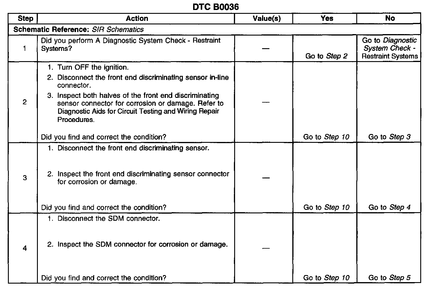 The numbers below refer to the step numbers on the diagnostic table: