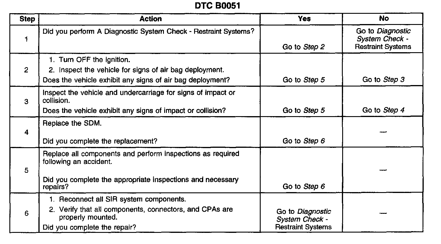 CIRCUIT DESCRIPTIONThe inflatable restraint sensing and diagnostic module (SDM) contains a sensing device (accelerometer) that converts vehicle velocity to an electrical signal. The SDM compares this signal to a value stored in memory. When the generated signal exceeds the stored value, the SDM performs additional signal processing and compares the generated signals to values stored in memory. When two of the generated signals exceed the stored values, the SDM will cause current to flow through the inflator modules, deploying the air bags and causing DTC B0051 to set.
