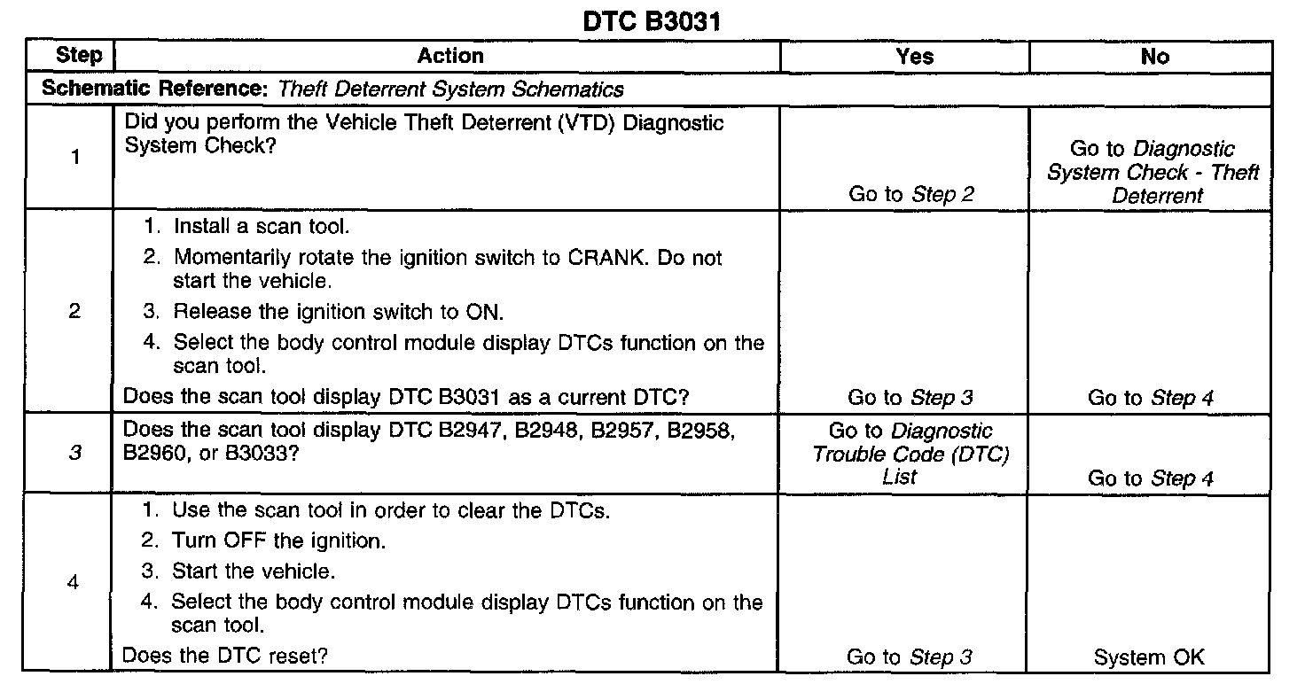 3. Tests for the proper operation of the 12 v reference Security Sensor Power circuit, sensor ground circuit, and Passlock(TM) sensor signal (data) circuit. Troubleshoot the appropriate DTC prior to diagnosing DTC B3031.