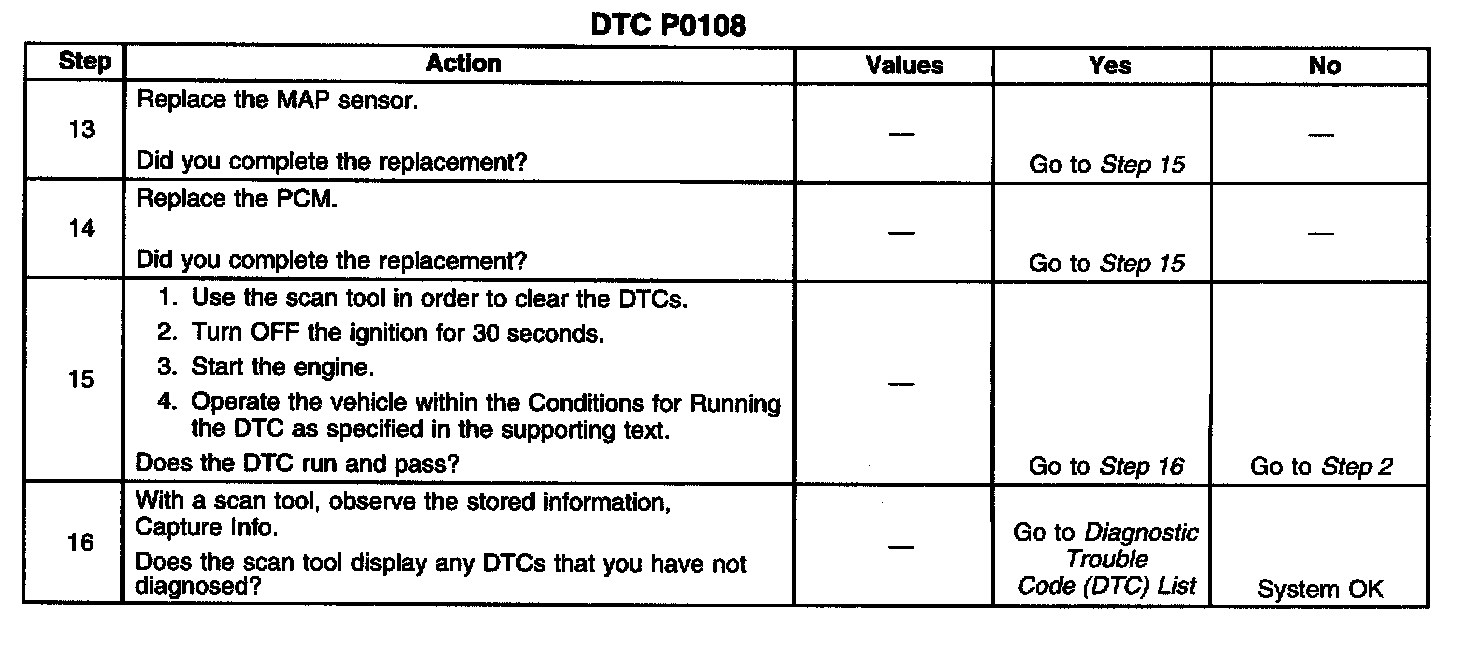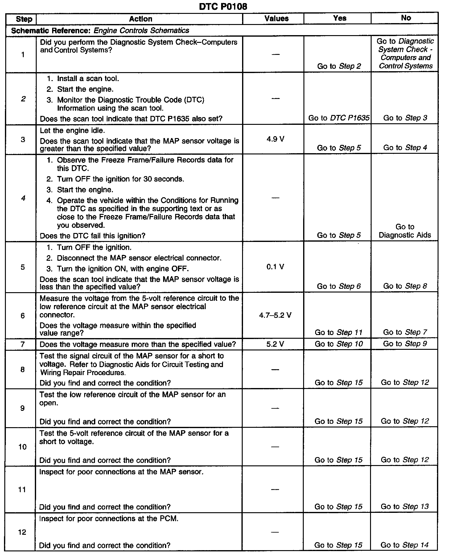 If the PCM detects a MAP sensor signal voltage that is excessively high, DTC P0108 will set.