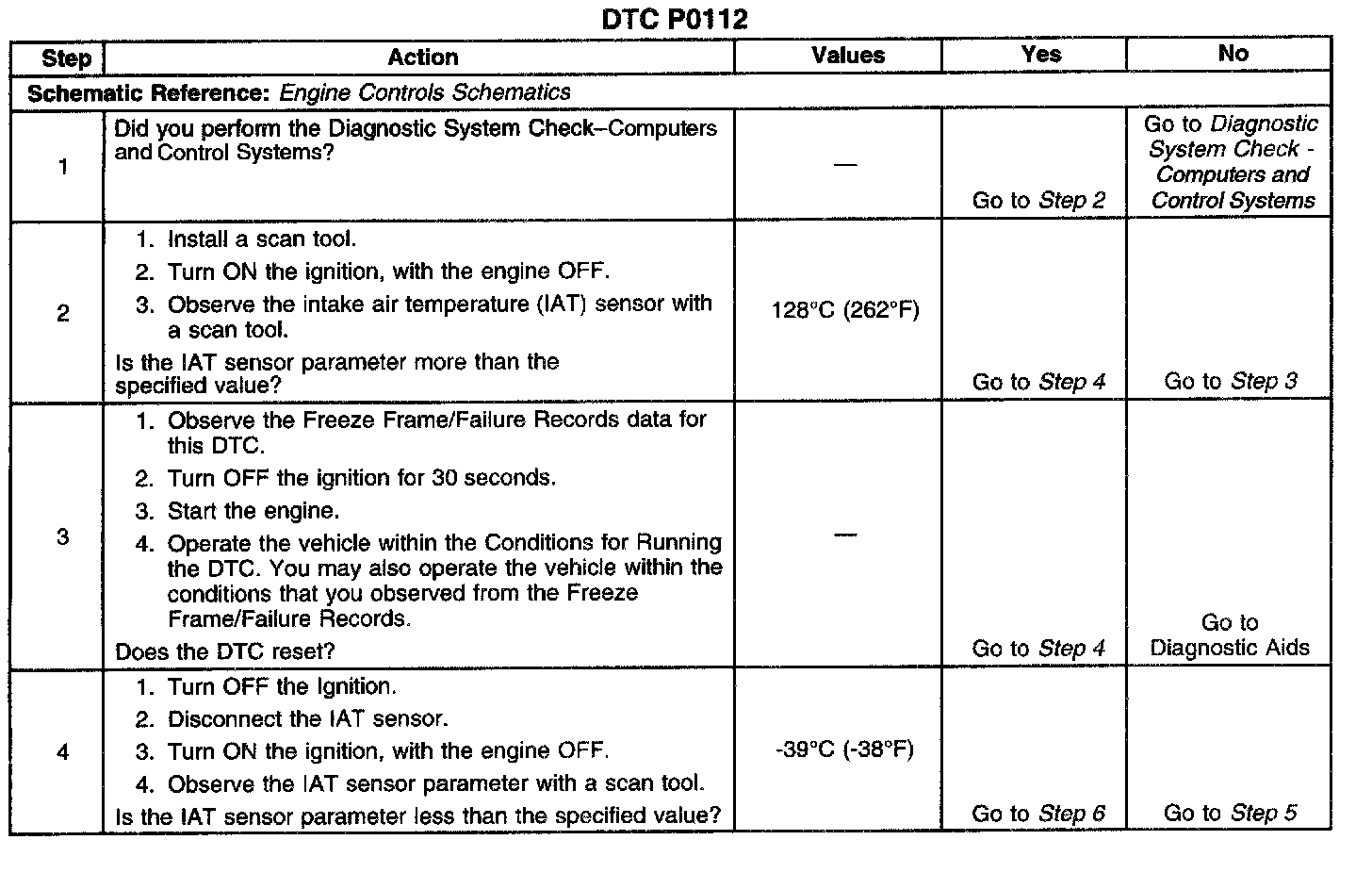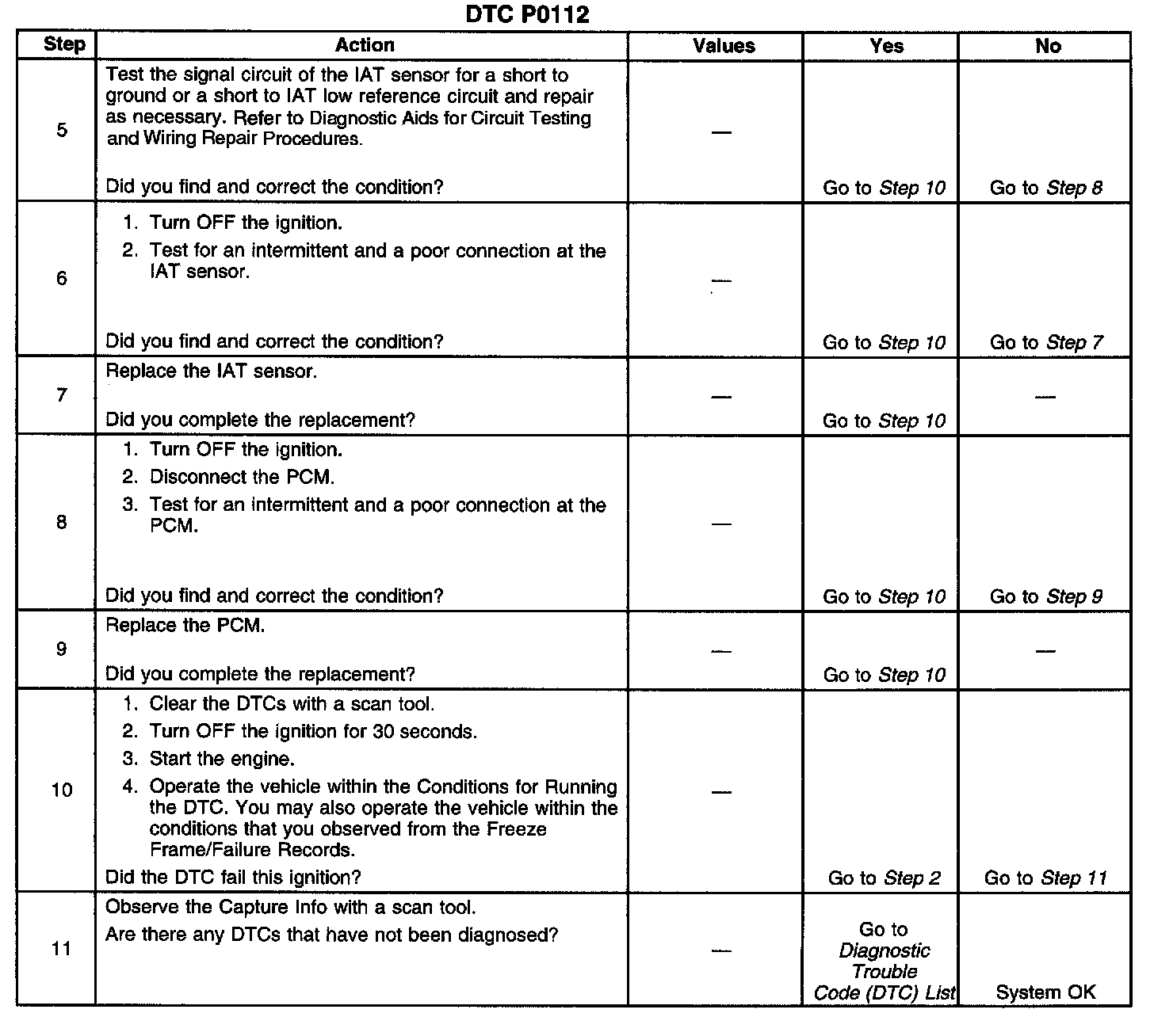 CIRCUIT DESCRIPTIONThe intake air temperature (IAT) sensor is a variable resistor, sometimes called a thermistor. The IAT sensor has a signal circuit and a low reference circuit. The IAT sensor measures the temperature of the air entering the engine. The powertrain control module (PCM) supplies 5 volts to the IAT signal circuit. When the IAT sensor is cold, the sensor resistance is high. When the air temperature increases, the sensor resistance lowers. With high sensor resistance, the PCM detects a high voltage on the IAT signal circuit. With lower sensor resistance, the PCM detects a lower voltage on the IAT signal circuit. If the PCM detects an excessively low IAT signal voltage, indicating a high temperature, DTC P0112 sets.